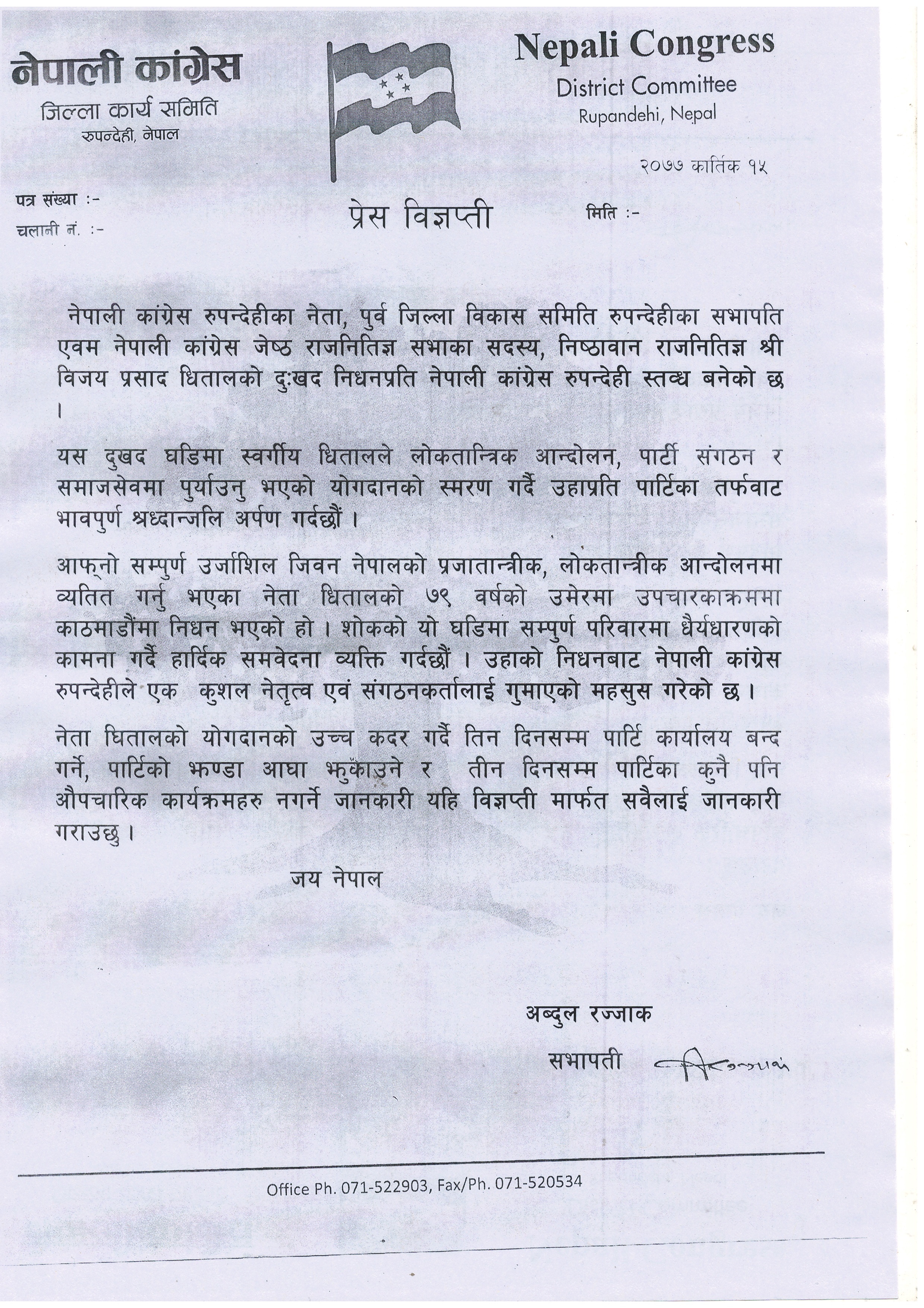 पार्टि सभापती अब्दुल रज्जाकले एक विज्ञप्ती जारी गर्दै रुपन्देहीको तिलोत्तमा ६ निवासी नेता धितालले लोकतान्त्रिक आन्दोलन, पार्टी संगठन र समाजसेवमा पुर्याउनु भएको योगदानको सदैव कदर गर्ने उल्लेख गर्नु भएको छ।