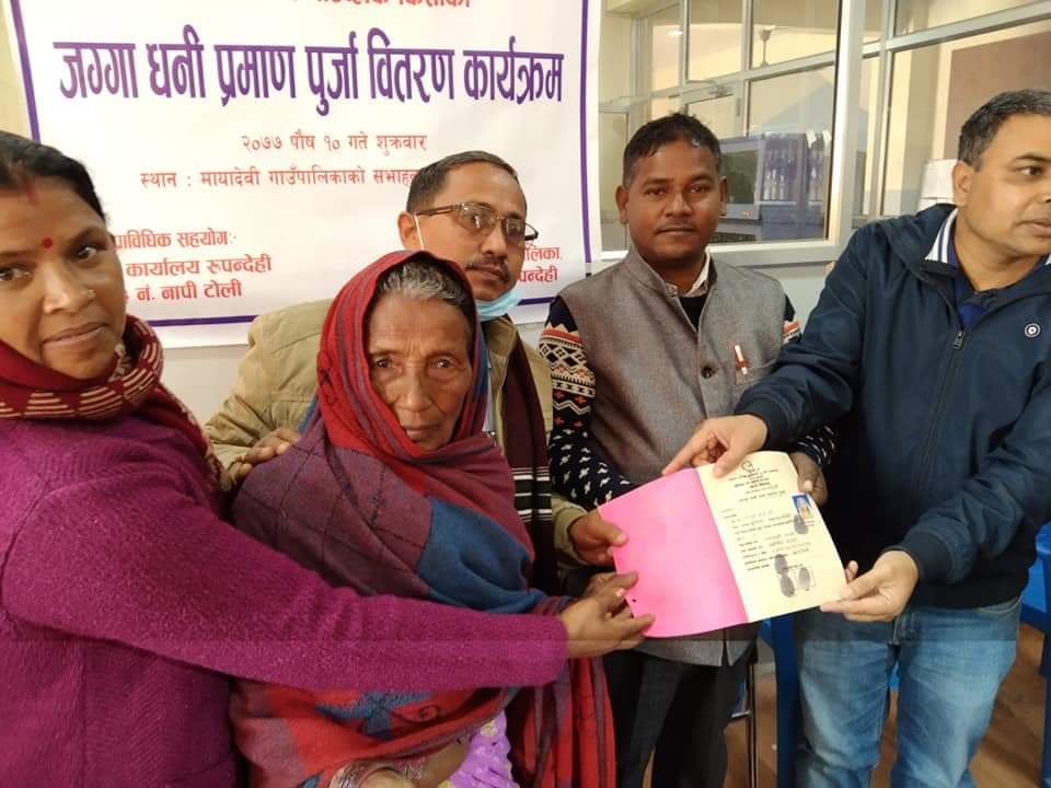 रुपन्देहीको मायादेवी गाउँपालिका वडा नम्बर १ अन्तर्गत साविक खुदावगर १ ‘क’ को कित्ता नम्बर १९४ र १९६ सुरवल गाउँ ब्लकको जग्गाधनी प्रमाणपूर्जा वितरण गरिएको छ । नापी कार्यालय रुपन्देही ३ नम्बर नापी टोलीको प्राविधिक सहयोगमा जग्गाधनी प्रमाणपूर्जा वितरण गरिएको गाउँपालिकाका प्रमुख प्रशासकीय अधिकृत ऋषिराम पन्थीले बताए ।