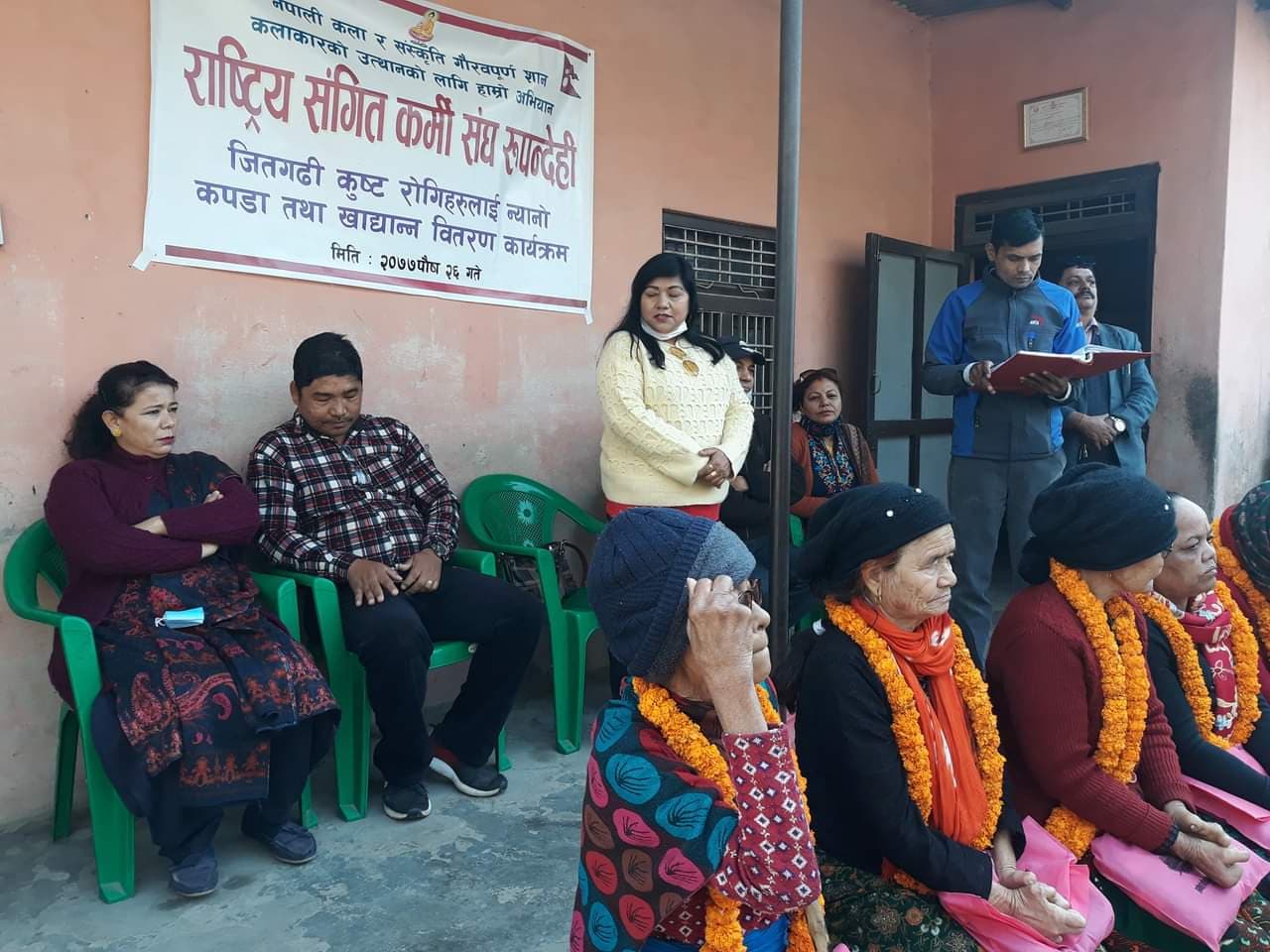 नेपाल संगितकर्मी संघ रुपन्देहीले कुष्ठ रोगीहरुलाई न्यानो कपडा तथा खाद्यान्न वितरण गरेको छ । बुटवलको जितगढीमा रहेको आश्रमका कुष्ठ रोगीलाई जाडोबाट बच्नको लागि भन्दै संगितकर्मीले न्यानो कपडा वितरण गरेको हो ।
