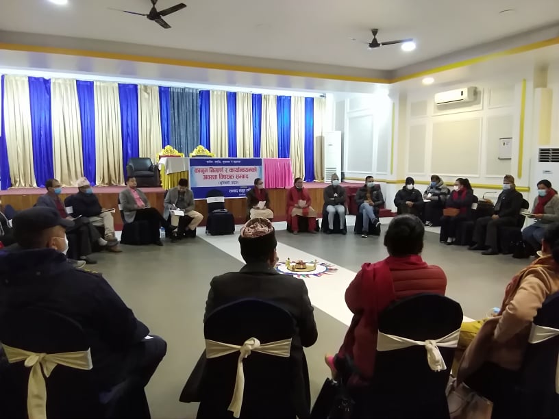 संवाद समूह सचिवालय दाङका सदस्य लीला पुनको सभापतित्वमा सम्पन्न कार्यक्रममा प्रदेश सभा सचिवालयका कानून सचिब सीता घिमिरे, उच्च अदालत बुटवल बारका अध्यक्ष जोगबहादुर खत्री, संसदीय मामिला पत्रकार समाजका अध्यक्ष विष्णु घिमिरे, पत्रकार महासंघ रुपन्देही उपाध्यक्ष नीरा गौतम, इलाका प्रहरी कार्यालय बुटवलका प्रमुख प्रतित सिहं राठौर, मानव अधिकारकर्मी रीमा बिसी,लेखक ऋषी आजाद,लेखक युवराज कंडेल, अधिवक्ता तथा पत्रकार ओम पंगेनी,समूहका सदस्य बाबुराम खनाल,अधिकारकर्मी रीता सेन वली,गोमा पन्थी,आनिक राना, अधिवक्ता विष्णुहरी धिताल, सहजकर्ता सुशिल बस्नेत लगायतले लगायतले धारणा राखेका थिए ।