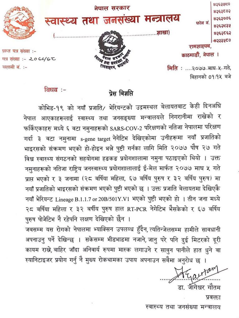 पुस पहिलो साता बेलायतबाट आएका ६ जनामा कोरोना संक्रमण भएको १३ पुसमा पुष्टि भएको थियो । तर जिन सिक्वेन्सिङ नभएका कारण नयाँ प्रकार भए/नभएको खुलेको थिएन ।